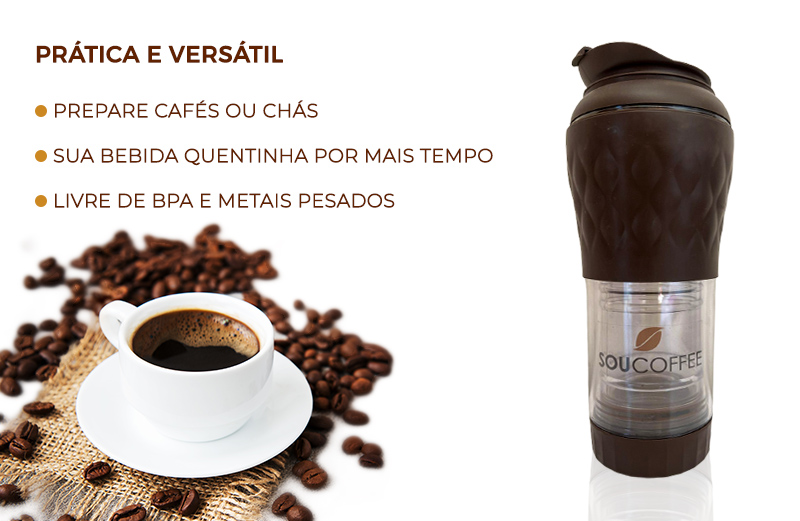 Com um sistema exclusivo de infusão e extração, a Cafeteira Portátil Sou Coffee é ideal para preparar café, chás e outras bebidas de forma prática e eficiente. Projetada para ser a menor, mais leve e versátil do mercado, ela é perfeita para acompanhar você em qualquer lugar.